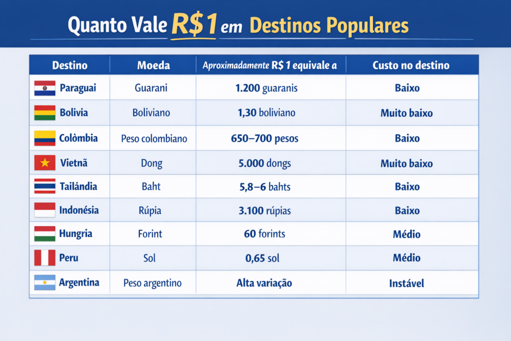O ponto principal não é apenas o câmbio, mas o custo de vida local. Alimentação, hospedagem e transporte têm muito mais impacto no orçamento do que a cotação isolada da moeda.