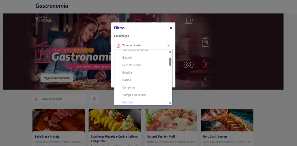 O LATAM Pass Gastronomia é uma plataforma que reúne restaurantes participantes onde o cliente pode acumular milhas ao consumir, seguindo as regras da campanha vigente.